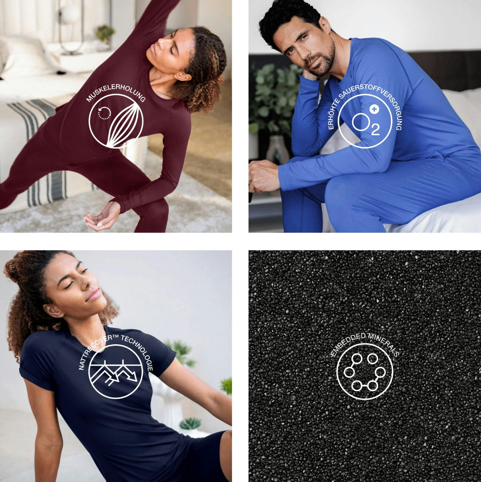 Diese Pyjamas bestehen aus Fasern von Eukalyptus, worin spezielle Mineralien eingearbeitet sind. Die Mineralien reflektieren die Körperwärme und wandeln sie in Fern-Infrarot-Energie um. Diese Energie dringt durch unsere Hautschicht durch, regt die Durchblutung an und unterstützt so die Sauerstoffversorgung unserer Muskulatur, was unsere natürliche Regeneration unterstützt. So können wir uns nach einer intensiven Trainingseinheit, einem intensiven Tag auf der Skipiste oder nach einem Wettkampf schneller erholen.