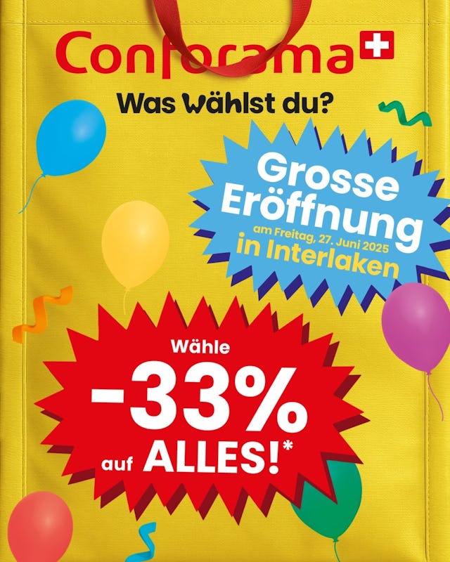 Aber auch, wer es nicht zur Eröffnung schafft, kommt bei Conforama in Interlaken voll auf seine Kosten: Bis 8. Juli 2025 warten exklusive Rabatte von bis zu 60 Prozent auf ausgewählte Möbel, Haushaltsgeräte, Deko, Technik und Küchen. Ansonsten gilt an diesen Tagen: satte Rabatte pur – mit minus 33 Prozent auf alles!