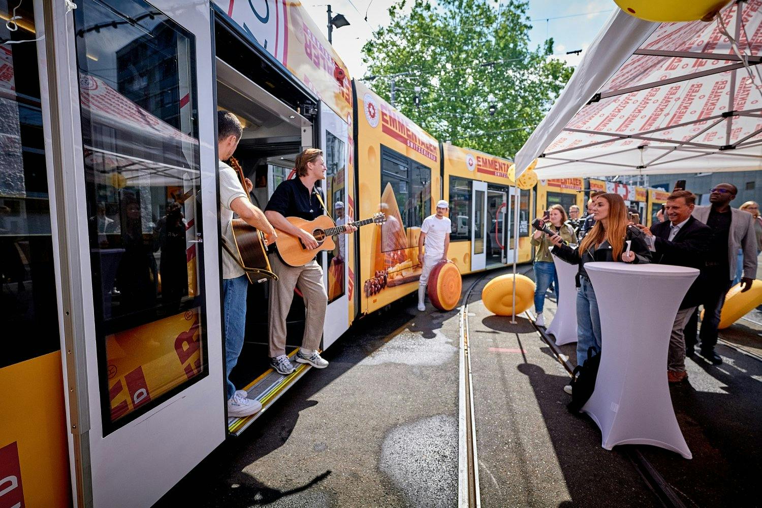 Musiker Nickless begleitete die erste Fahrt des Emmentaler AOP Trams live. Das ikonische Lochdesign-Tram fährt während zehn Monaten durch Bern – pünktlich zum Jahr der World Cheese Awards 2025 und als starke Botschaft für Schweizer Käsetradition und -kultur.