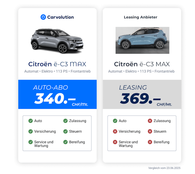 Ein Auto mit Abo zum monatlichen Fixpreis. Der Schweizer Auto-Abo-Pionier Carvolution bietet rund 40 Fahrzeugmodelle zum Fixpreis für Private und Firmen an: vom Kleinwagen für die Stadt bis zum Premium-SUV, elektrisch, hybrid oder konventionell. Steuern, Versicherung sowie Reifenwechsel und Service beim Garagisten in der Nähe sind inklusive.