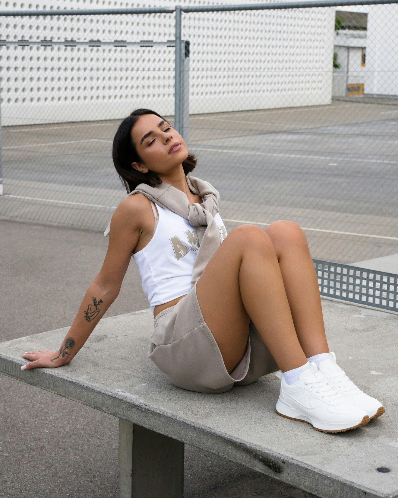Auch Sweat-Sets sind im Sommer 2025 ein Must-have: Ob in neutralen Tönen wie Schwarz und Grau oder in frischen Farben – sie sehen immer nach bewusstem Styling aus. Gerade jetzt im Sommer ist sorgt ein feminines Tank-Top in Weiss in Kombination mit einem Rucksack in Navy für das trendy Styling für unterwegs.