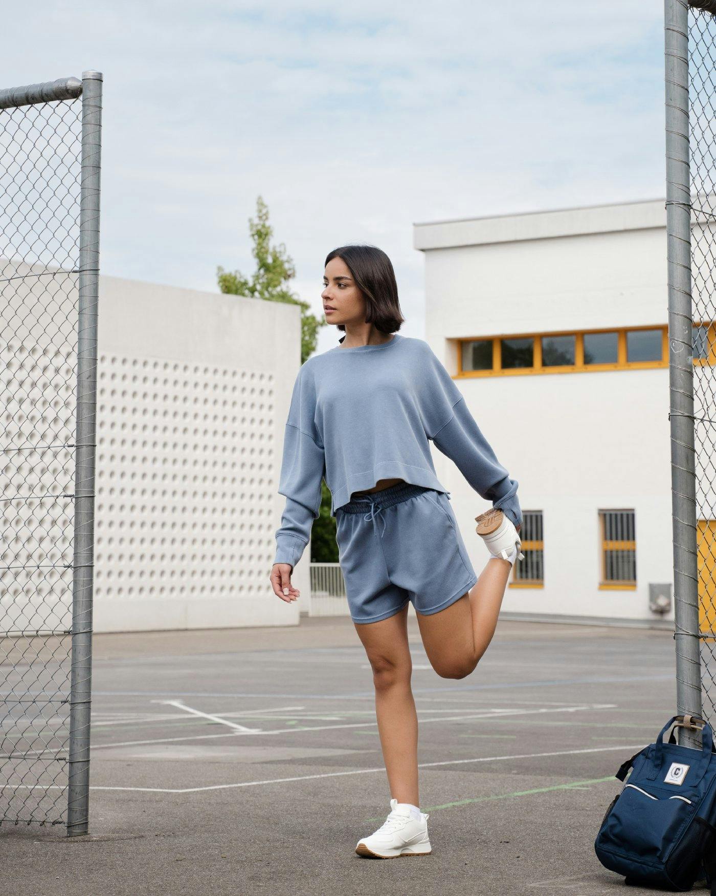 Styling-Tipp: Spiele mit Gegensätzen. Ein sportliches Oberteil wirkt mit einer Stoffhose plötzlich bürotauglich, während Sweatshorts in Taupe mit einer schicken Bluse und dezentem Schmuck einen spannenden Bruch erzeugen. Wer es minimalistisch mag, setzt auf monochrome Outfits; wer lieber auffällt, kombiniert kontrastierende Farben und auffällige Accessoires.