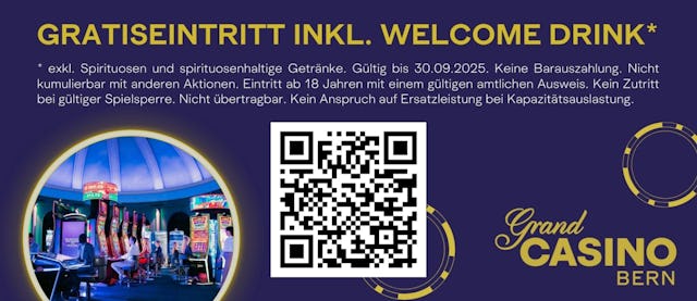 Sichere dir mit untenstehendem Gutschein freien Eintritt ins Grand Casino Bern und einen Welcome Drink!
