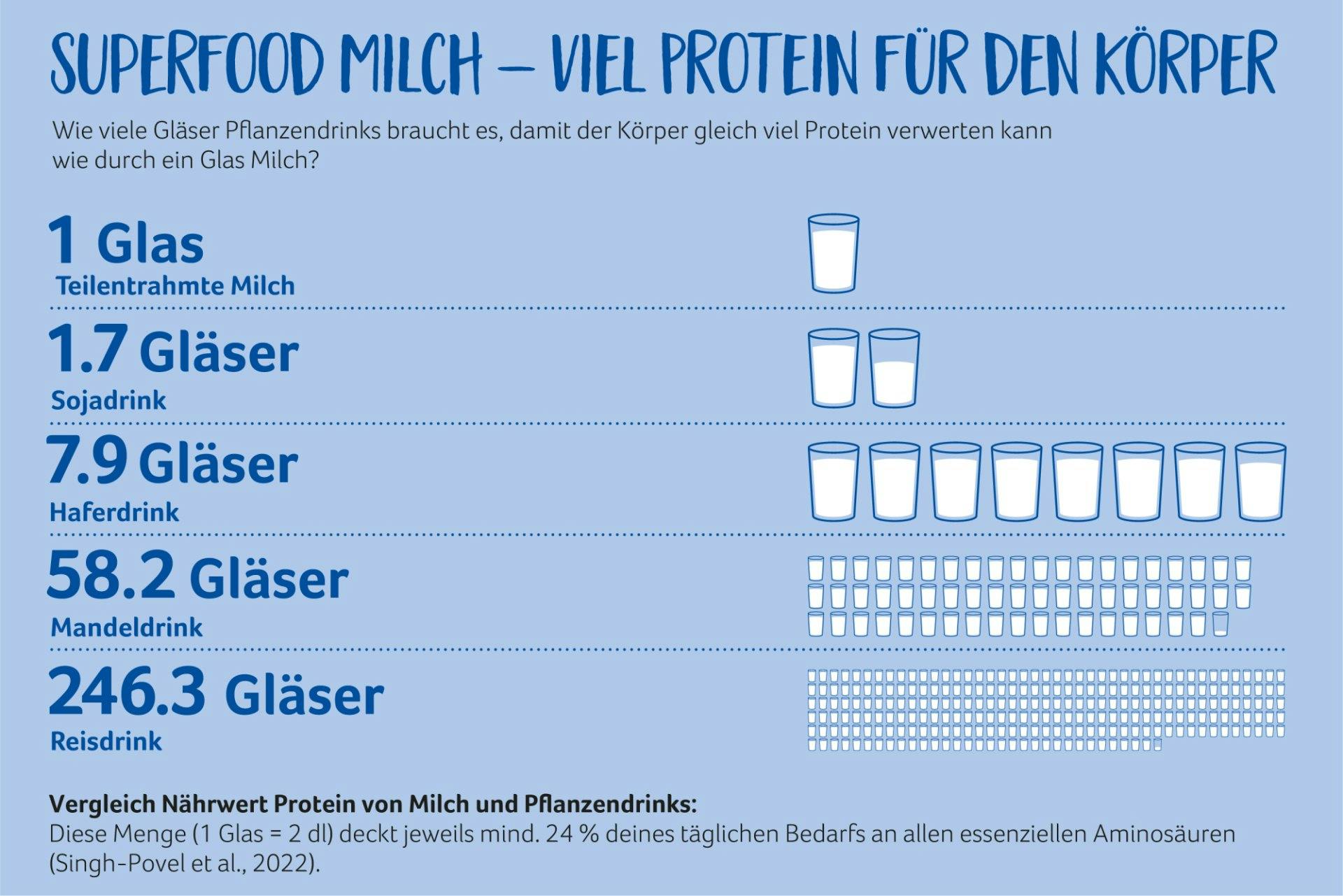 Milch enthält hochwertiges Protein, das vom Körper besonders effizient verwertet werden kann. Die meisten Pflanzendrinks enthalten weniger Proteine und solche, die der Körper schlechter verwerten kann. Um den gleichen Protein-Nährwert wie mit einem Glas Milch zu erreichen, wären mehrere Gläser Pflanzendrink nötig.