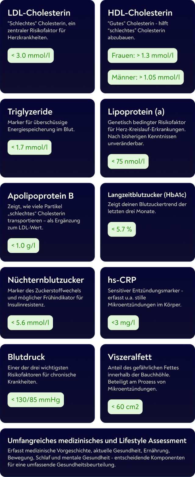 Bei CARE begleitet Dr. med. Rabea Schlenker Menschen dabei, diese Gesundheitsrisiken fassbar zu machen – und individuell gegenzusteuern. Hierfür werden 59 Biomarker gemessen, dazu zählen 44 Blutwerte, der Blutdruck sowie eine Analyse des Muskel- und Fettanteils.