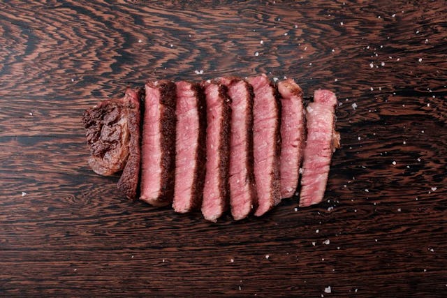 Am besten legt man das Steak nun auf ein leicht vorgewärmtes Gitter oder Schneidbrett (nicht zu heiss, sonst versaut man sich am Ende noch die Garstufe), deckt alles leicht mit Alufolie leicht ab (nicht komplett verschliessen, sonst weicht sich die Kruste wieder auf) und lässt es fünf Minuten stehen. Achtung: Die Hitze wandert immer noch weiter ins Innere des Steaks. Das können gut und gerne bis zu 5° C sein - das Fleisch also immer etwas vor der gewünschten Garstufe aus der Pfanne nehmen. Danach lässt sich das Steak quer zur Faser aufschneiden und mit einem guten Salz, wie dem vom Murray River, berieseln und geniessen.