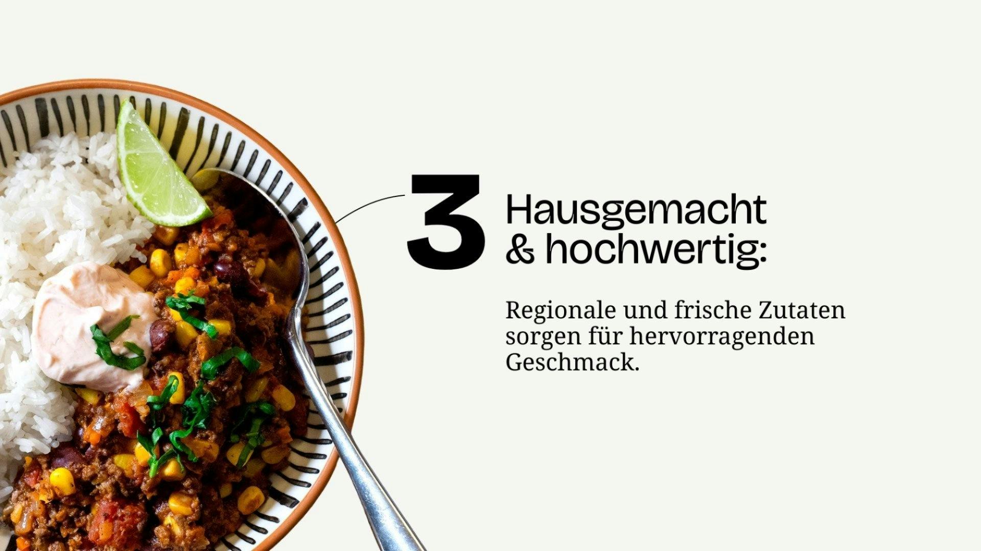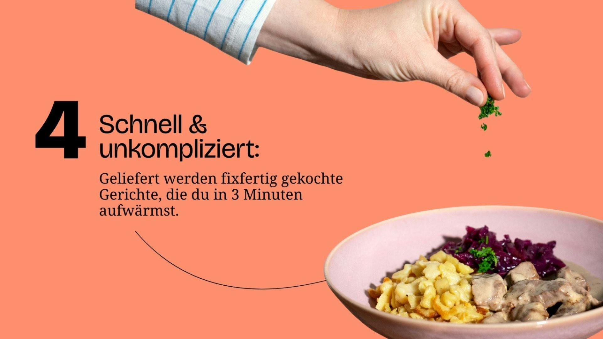 Eine Auswahl an herzhaften Klassikern, spannenden Neuinterpretationen, feinen Suppen und individuell kombinierbaren Beilagen sorgt für eine abwechslungsreiche Menükarte. Aktuell erhältst du 20-Prozent-Willkommensrabatt auf deine erste wöchentliche Menü-Box – ergänzt durch zusätzliche Überraschungen in den Folgewochen.