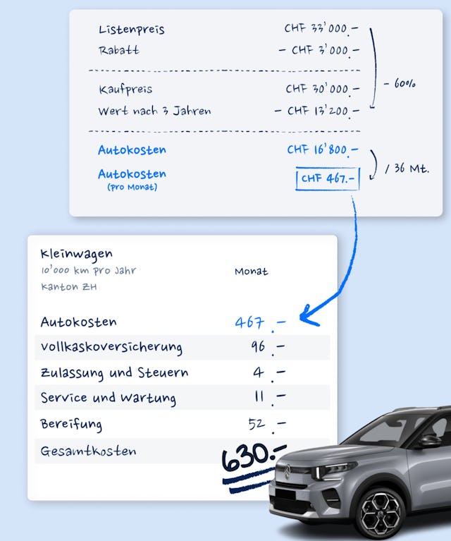 Die Differenz aus Kaufpreis mit Rabatt (30’000 Franken) und dem Restwert (13’200 Franken) ergibt 16’800 Franken und damit den Wert, den einen das Auto während dieser Zeit gekostet hat. Verteilt auf die 36 Monate kommen also monatlich 467 Franken als reine Autokosten zusammen.