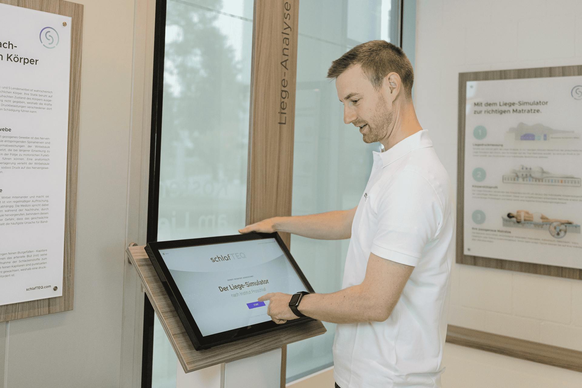Beim zertifizierten Schlafexperten Jakob Schenk kommt deshalb der Liege-Simulator zum Einsatz, der gemeinsam mit Schlafforschern, Medizinern und Physiotherapeuten am Institut Proschlaf in Salzburg entwickelt wurde. Nach wenigen Minuten berechnet das patentierte Vermessungsinstrument, wieviel Druck der Körper auf eine Testmatratze ausübt. Danach weiss man mit objektiver Gewissheit, an welchen Stellen der Körper im Liegen Unterstützung braucht.