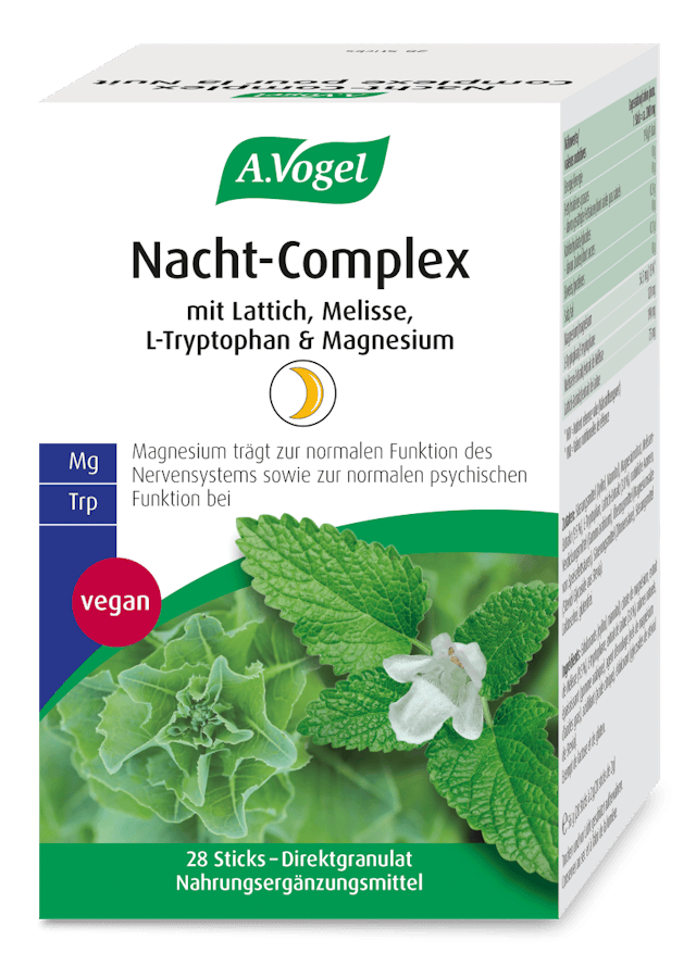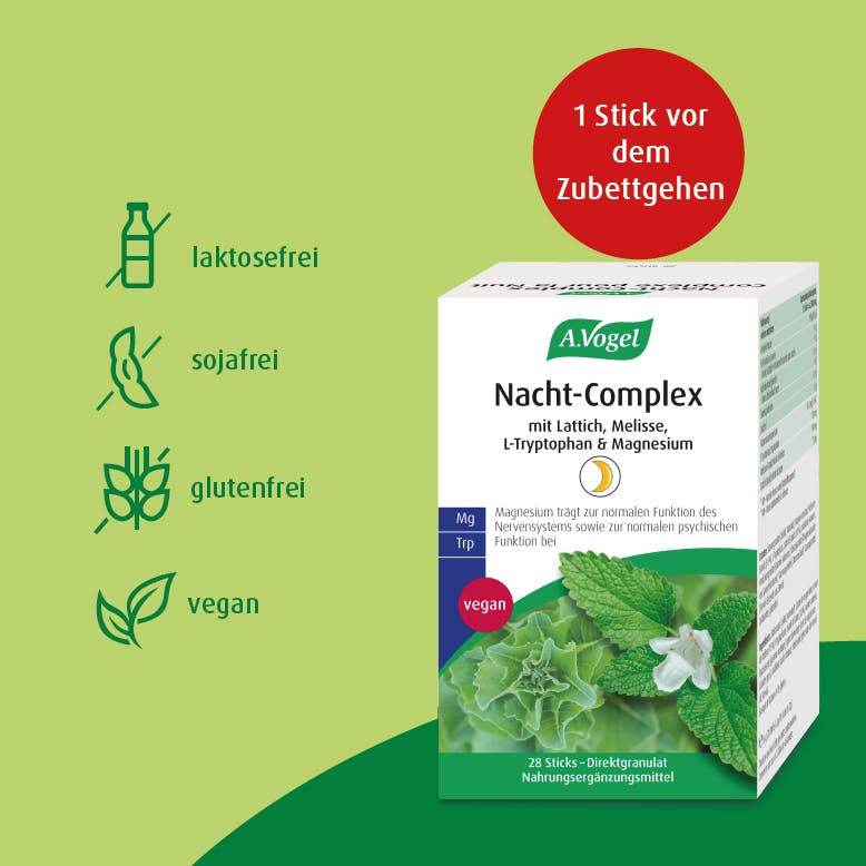 Nacht-Complex ist ein Nahrungsergänzungsmittel mit einer sinnvoll aufeinander abgestimmten Kombination aus Lattich- und Melissen-Extrakt, L-Tryptophan sowie Magnesium. Ob daheim vor dem Zubettgehen, auf Geschäftsreise oder in den Ferien: Das Nacht-Complex-Granulat im praktischen Stick kann direkt im Mund oder, je nach Vorliebe, in etwas Wasser oder Saft aufgelöst werden.