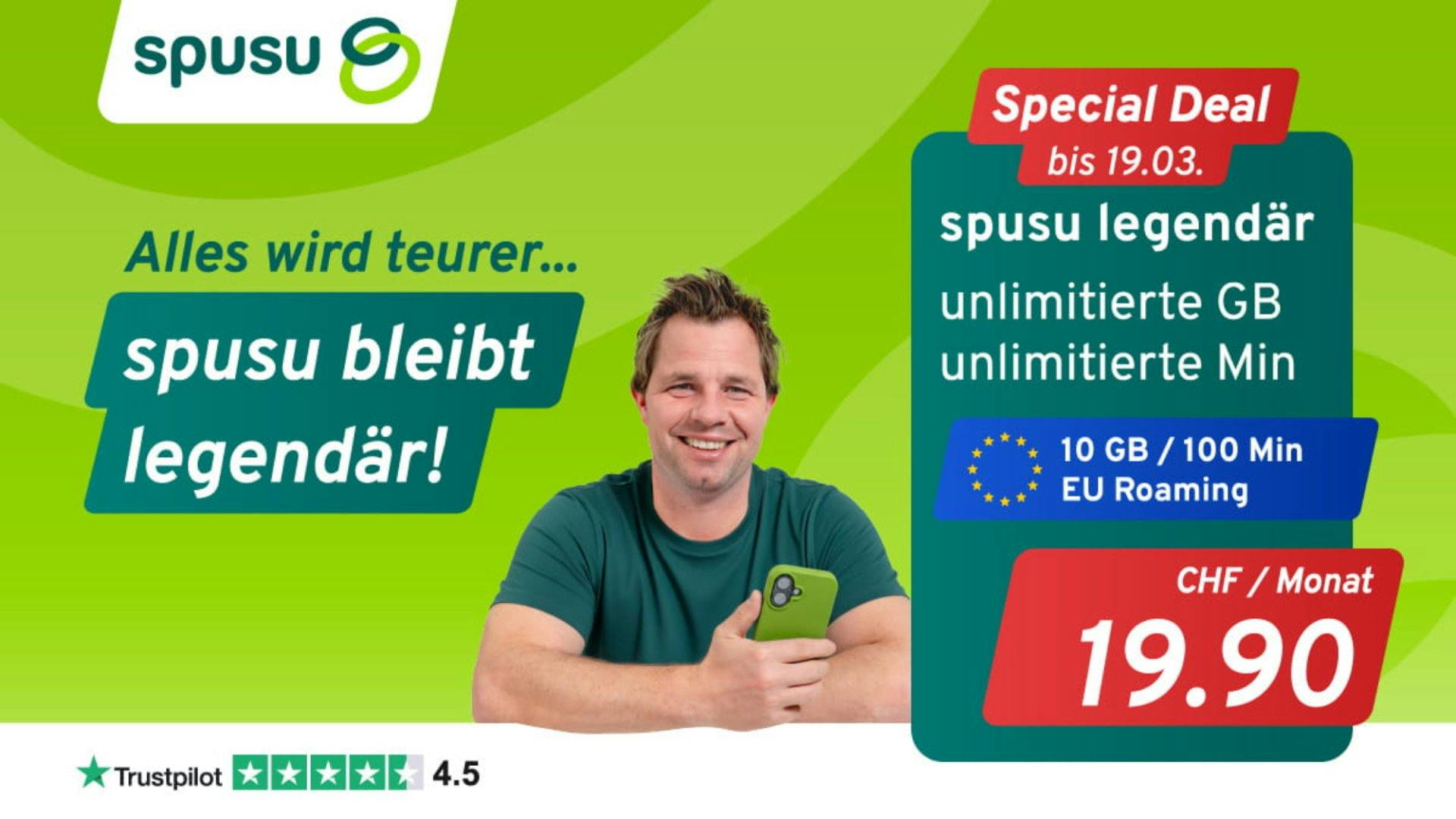 Aktuell bietet spusu das Abo «spusu legendär» mit unlimitiertem Datenvolumen im 5G-Netz, unlimitierten Minuten und SMS für nur 19.90 Franken. Ausserdem inkludiert: 10 Gigabyte, 100 Minuten und 100 SMS im EU-Roaming.