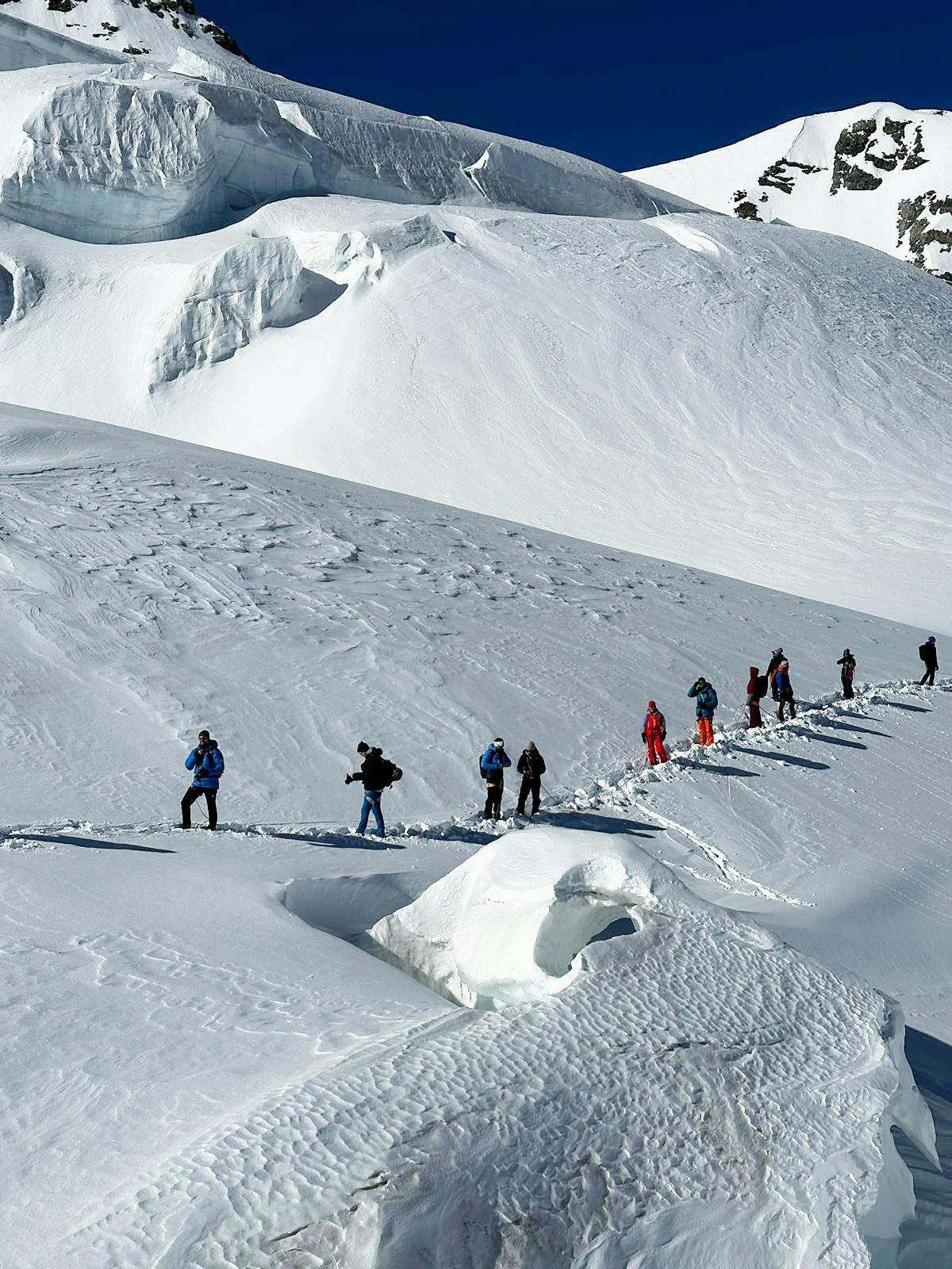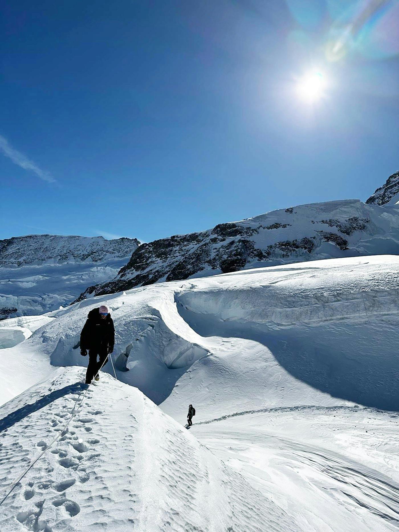 Nach der Fahrt in der Jungfraubahn geht es oben auf dem Jungfraujoch auf Erlebnistour. Stephan Siegrist, einer der bekanntesten Schweizer Extrembergsteiger, führt dich auf einer rund 90-minütigen Gletscherwanderung durch die eindrucksvolle Hochgebirgslandschaft.