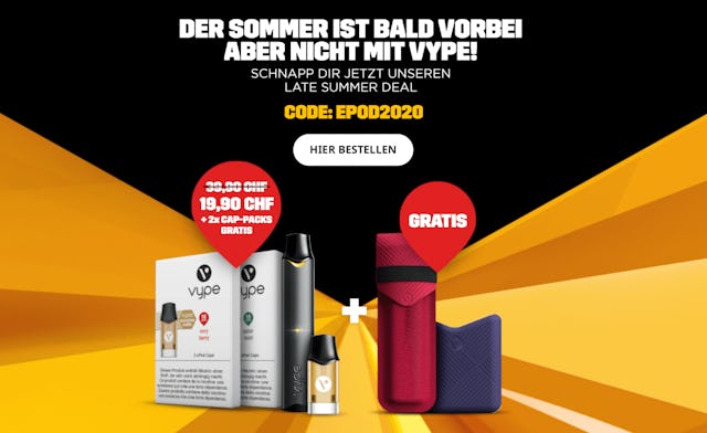 Damit dein Sommer auch wirklich zum Genuss wird, kannst du dir bei Vype deinen «Late Summer Deal» zusammenstellen. Dabei bekommst du 50 Prozent Rabatt auf das ePod-Starterkit und gratis dazu noch zwei Packungen Caps und zwei Vype-Accessoires!