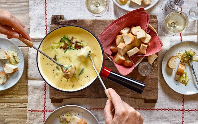 Das ideale Fondue-Set für einen stimmungsvollen Käsefondue-Abend mit einem Touch Exklusivität. Das Set besteht aus einem Steingut-Caquelon, einem Bambussockel, einem Rechaud aus Edelstahl und sechs Fondue-Gabeln.