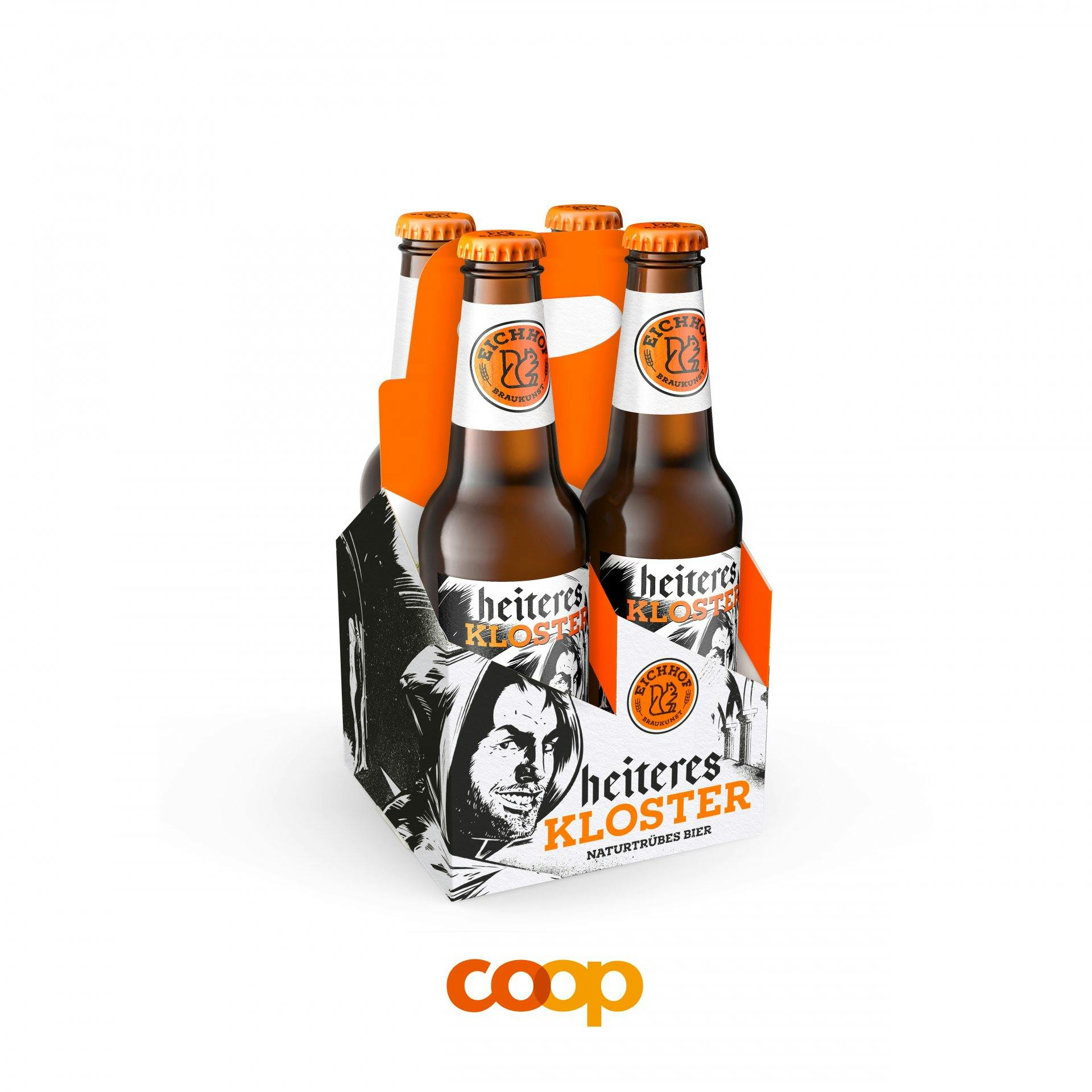 Das «Heitere Kloster» wird unfiltriert abgefüllt. Das führt zu einem naturtrüben, vollmundigen Bier, das mit feinen Hefearomen auftrumpft und mit einer fruchtigen Note begeistert. Neu als 4x33cl Packung in deinem Coop in der Zentralschweiz erhältlich oder im Offenausschank in der Gastronomie.
