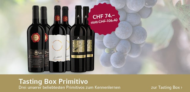 Welcher ist dein Favorit? Mit der Mövenpick Wein Tasting Box Primitivo hast du die Möglichkeit, in die Welt der Primitivos einzutauchen und drei verschiedene Weine zum Spezialpreis kennenzulernen. Die Box enthält jeweils zwei Flaschen eines Weins. So hast du gleich Nachschub von deinem Liebling oder ein begehrtes Mitbringsel für die nächste Einladung. Denn eines ist sicher: Die Fangemeinde der Primitivos wird immer grösser.