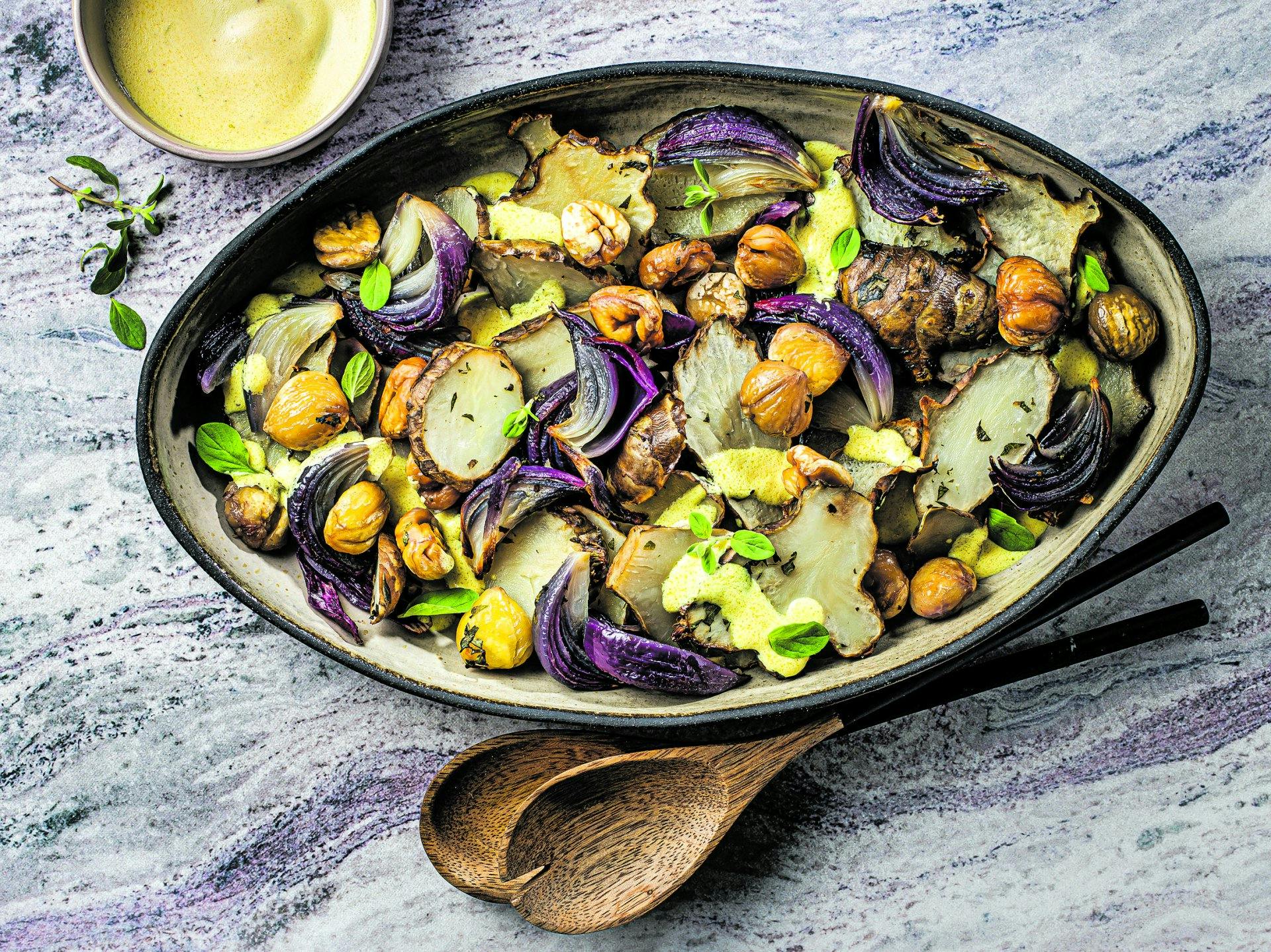1. Topinambur: Topinambur, Marroni, Zwiebeln und Majoran mit Öl und Salz ­mischen, auf ein mit Backpapier belegtes Blech geben.