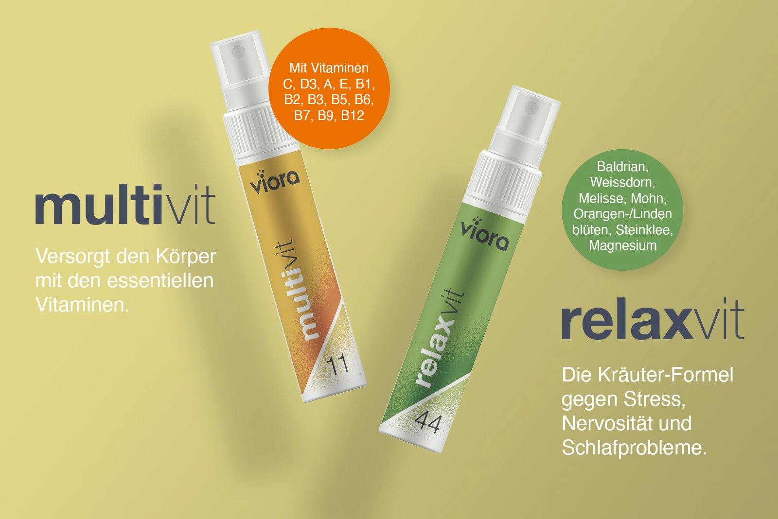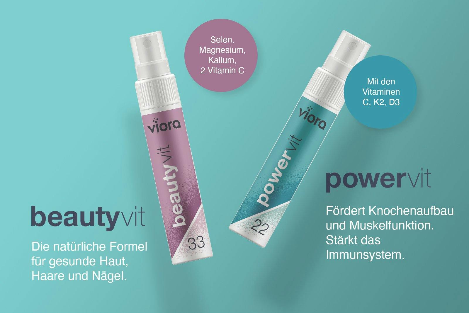 Viora-Sprays sind die ideale Lösung für zuhause oder unterwegs. Denn für die Einnahme braucht es weder Wasser noch ein Glas. Mit Viora können die wertvollen Vitamine einfach und komfortabel genau dann eingenommen werden, wenn der Körper sie braucht.