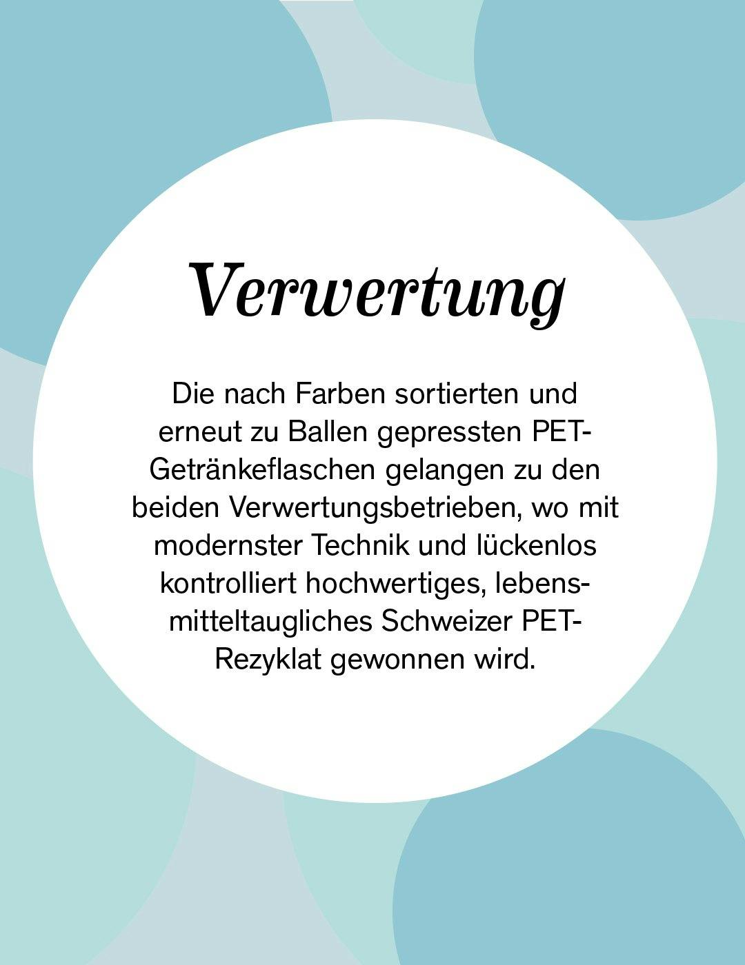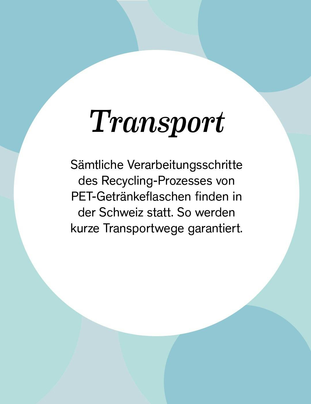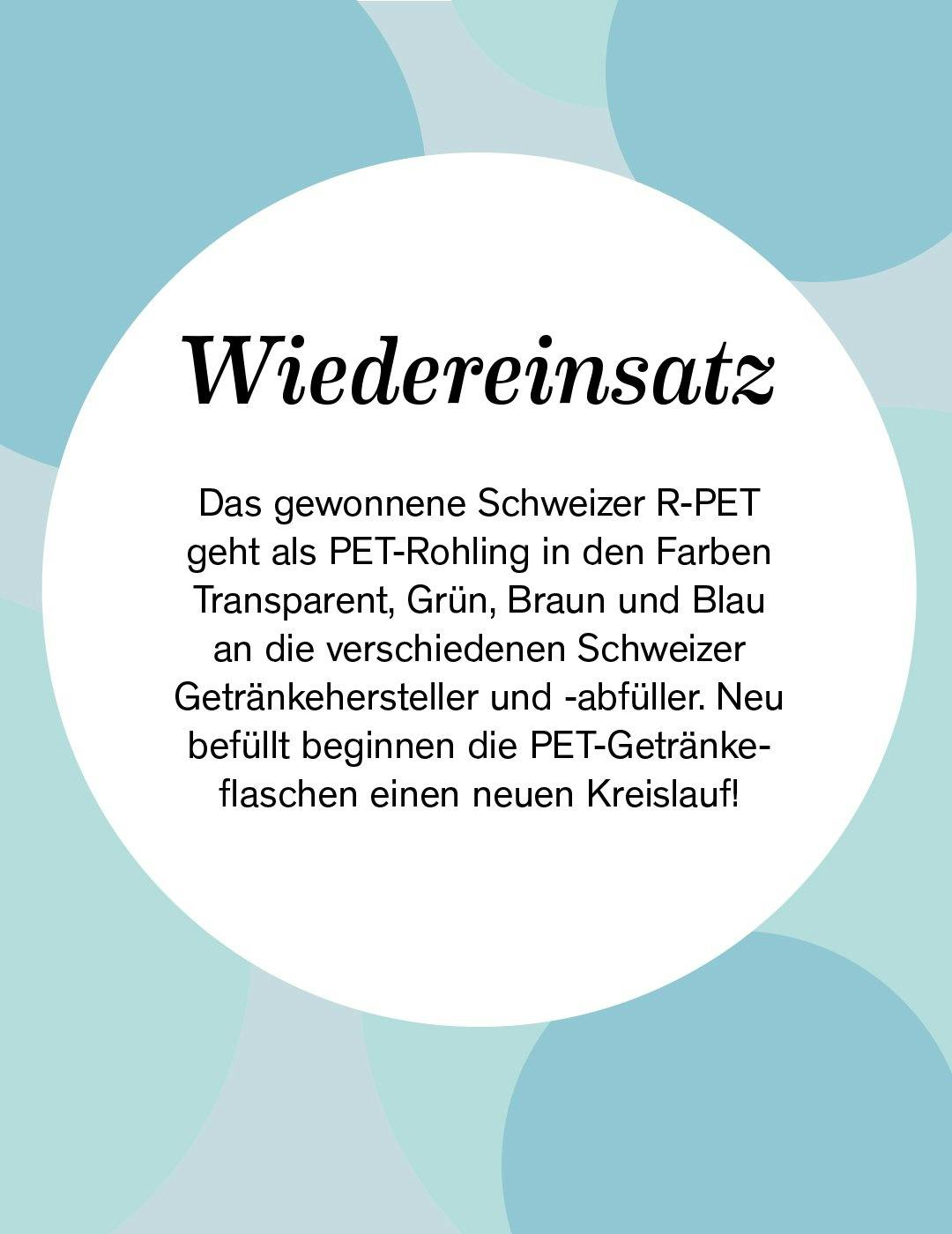 Stolze 82 Prozent der PET-Getränkeflaschen finden hierzulande ihren Weg zurück in den Kreislauf. Dieser Erfolg basiert auf dem landesweiten Bewusstsein, die Umwelt und Ressourcen zu schonen. Der gesamte PET-Recycling-Prozess findet jährlich mit rund 1,3 Milliarden Getränkeflaschen und nach Schweizer Qualitätsstandard statt: entsprechende Kompetenzzentren sind dabei in der Verantwortung und füllen an derzeit 15 Standorten diverse Getränke in Schweizer R-PET, also wiederverwendete Kunststoffflaschen.