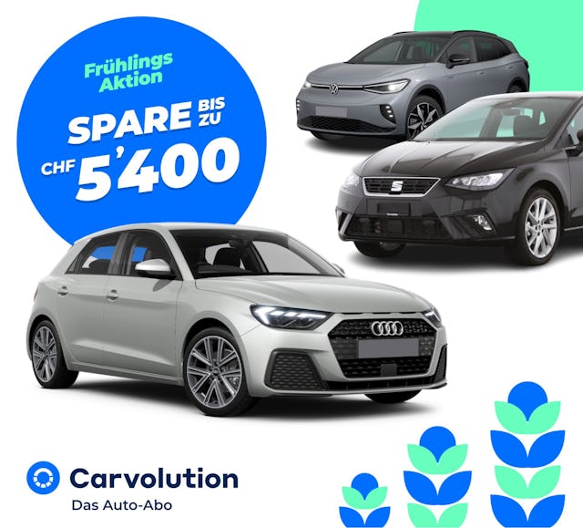 Profitiere bei der Carvolution Frühlingsaktion von bis zu 5’400 Franken Rabatt. Mit dabei sind Modelle von Audi, Seat, VW und weiteren Marken für unterschiedliche Laufzeiten.