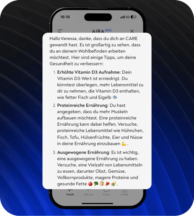 Die Künstliche Intelligenz von Care ist in der Lage, komplexe Gesundheitsinformationen aus verschiedenen Quellen zu verarbeiten. Dadurch kann «AIRA» ihre Lifestyle-Empfehlungen individuell an deine Bedürfnisse anpassen.