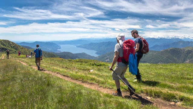 Dort erwartet dich ein 360-Grad-Panoramablick, der vom Lago Maggiore über den Luganer See bis hin zu den majestätischen Gipfeln der Alpen reicht. Der Höhenweg führt weiter zum Monte Lema. Tessiner Spezialitäten kannst du in den Restaurants auf dem Monte Lema sowie auf dem Monte Tamaro geniessen.