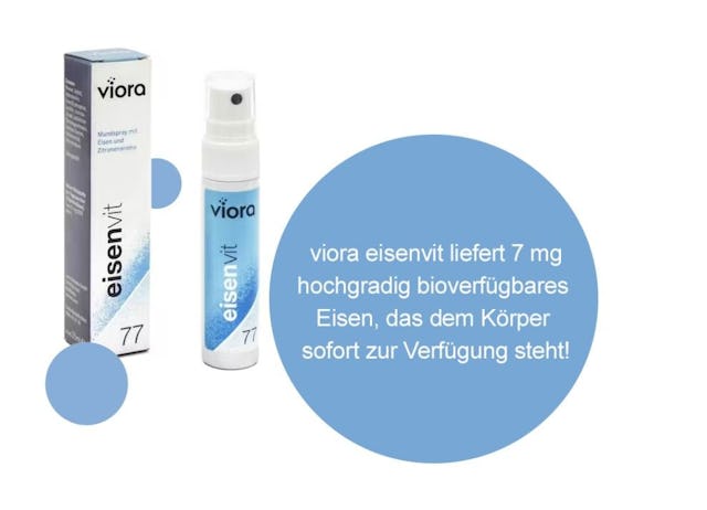 Die durchschnittliche Menge Eisen im Körper beträgt bei Frauen drei Gramm und bei Männern vier Gramm. Um diesen Level zu halten, müssen täglich zwischen zwei und vier Milligramm Eisen über den Darm resorbiert werden. Da die Darmschleimhaut nur mit der Nahrung aufgenommenes Eisen aufnehmen kann, muss die Eisenzufuhr ungefähr vier- bis achtmal höher sein. Das ist der Grund, weshalb die Aufnahme über die Mundschleimhaut mit VIORA drei bis viermal effizienter ist.