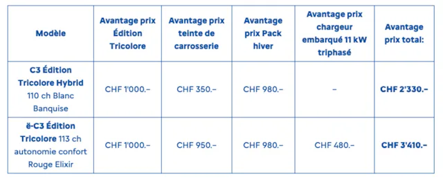 Basée sur la finition la plus haut de gamme, MAX, cette édition spéciale offre un avantage client entre 2330 francs et 3410 francs selon la version et la teinte. Quelle que soit la teinte choisie, la Citroën C3 Édition Tricolore Hybrid 110 est proposée à 23'890 francs, tandis que la Citroën ë-C3 Édition Tricolore l’est à 26'990 francs.