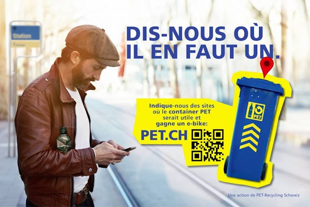 Dans cette optique, PET-Recycling Schweiz lance l’action «conteneur PET». Le message est simple: «Dites-nous où vous voulez avoir des conteneurs PET.» Dans un parc? Au centre-ville? Sur les rives du lac ou de la rivière, sur la place du village, dans la zone piétonnière ou à un arrêt de bus? Dès maintenant sur PET.ch, il est possible de soumettre des suggestions d’emplacement de conteneurs PET dans l’espace public sur une carte virtuelle. Toutes les suggestions envoyées sont réunies par PET-Recycling et soumises aux responsables des communes.