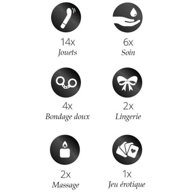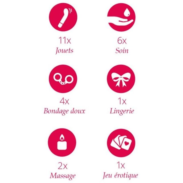 Dans les trois versions, tu trouveras de nombreux sextoys variés pour femmes et hommes: plusieurs produits de soin et de bondage, de la lingerie, des huiles de massage et un jeu de cartes érotique. Avec le calendrier de l’Avent est aussi fourni un petit livret qui contient des textes expliquant ce qui se trouve dans chaque petite boîte et pouvant aussi stimuler ton imagination.