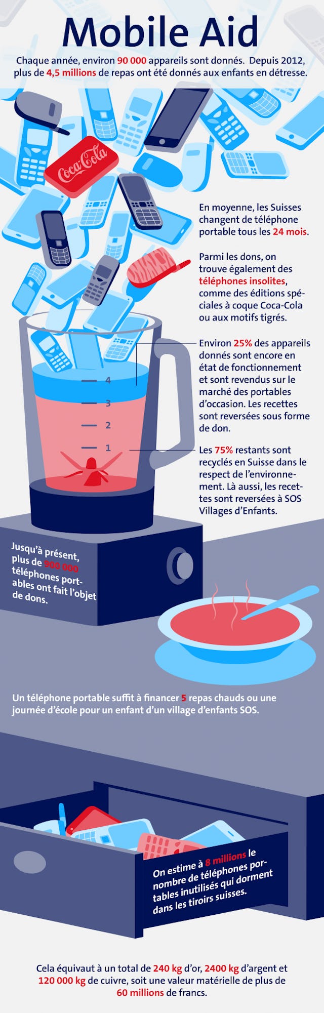 Selon l’état de ton ancien appareil, Swisscom Mobile Aid le revend, une fois toutes les données effacées, ou le démonte et le recycle de manière professionnelle. La totalité des recettes issues de la revente et du recyclage est reversée à SOS Villages d’enfants.