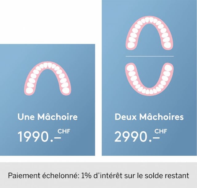 Peu importe la durée de ton traitement ou le nombre de gouttières dont tu as besoin, le prix reste le même, les consultations avec le dentiste sont incluses dans le prix. Tu paies un prix fixe de 1990 francs pour une mâchoire et 2990 francs pour deux mâchoires, rien de plus.