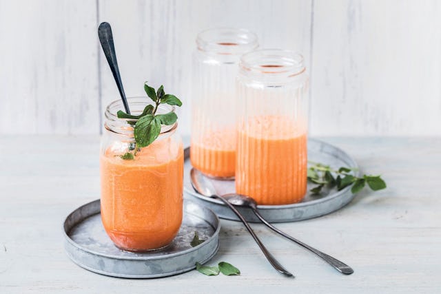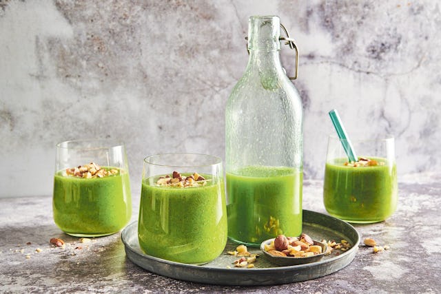 Si on souhaite réduire la teneur en sucre, mais pas renoncer aux vitamines et aux fibres, on a ce qu’il faut avec les smoothies purs légumes. Les ingrédients particulièrement appréciés sont les variétés de légumes riches en eau comme les tomates, les concombres ou les poivrons. Mais tu peux essayer toutes les combinaisons possibles selon tes goûts. Si tu les aimes plus corsés, pas de problème non plus: les épices ne sont pas interdites et peuvent même donner un coup de boost.