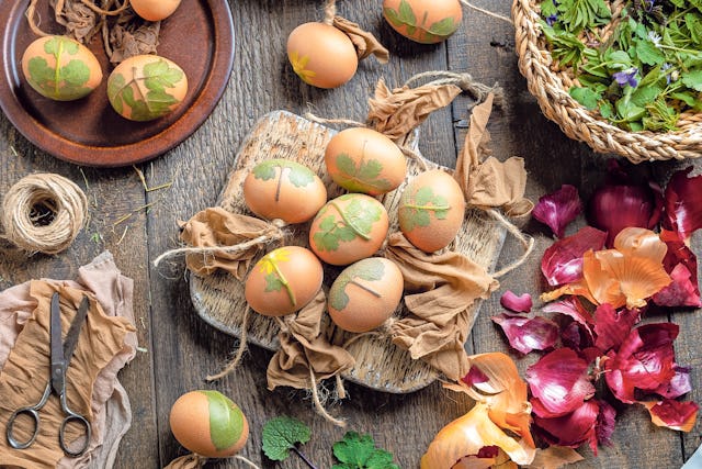 Voilà comment faire: avant de teindre les œufs, lave-les dans de l'eau vinaigrée, qui aidera la couleur à mieux tenir. Ensuite, prépare ton bouillon teinté. Remplis une vieille casserole (car la couleur peut s'incruster) d'environ un litre d'eau et fais-la bouillir avec un matériau naturel de ton choix. Les œufs prendront une couleur rouge cuits avec des betteraves ou des pelures d'oignons rouges, deviendront bruns avec du café, des pelures d'oignons brunes ou du thé noir, jaunes avec du curcuma, verts avec des épinards ou des orties et bleus ou violets avec des myrtilles ou du chou rouge. En règle générale, deux tasses de l'aliment sont nécessaires pour un litre d'eau. Pour les épices, environ deux cuillères à soupe suffisent. C’est le moment d'expérimenter et de t’amuser!