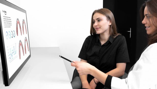 Lors de ton deuxième rendez-vous, le dentiste discute avec toi de ton plan de traitement personnalisé et te présente une animation 3D du résultat final de tes dents post-traitement.